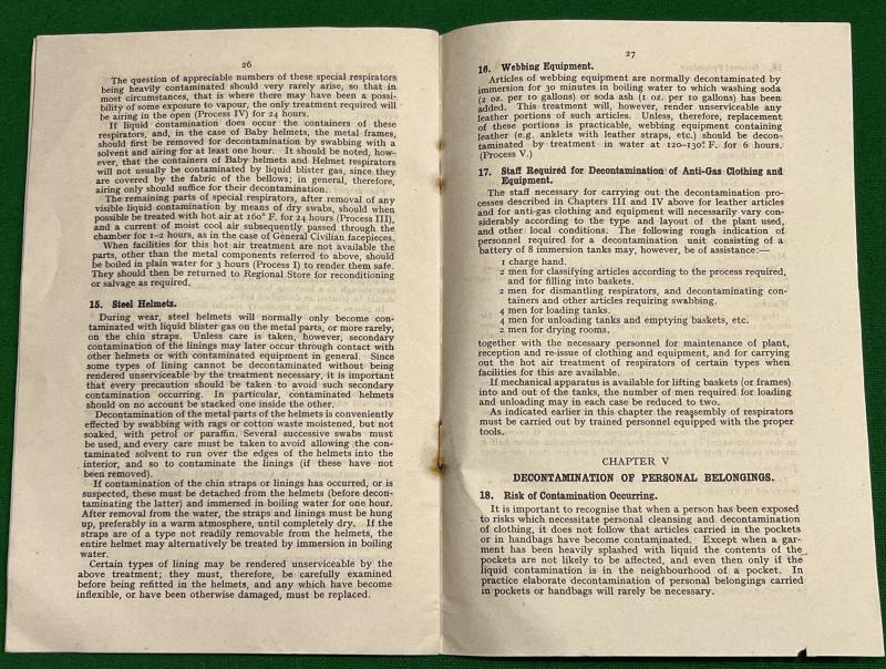 1942 ARP Handbook No.4A Decontamination of clothing, including Anti-Gas clothing & Equipment from Persistent Gases. 31pgs, paper covers, offering advice and instructions on decontamination of everything from steel helmets to personal effects. Good, used condition with cover marked ' Paper Salvage ' with creasing, marking and rust staining.Another of the more uncommon handbooks