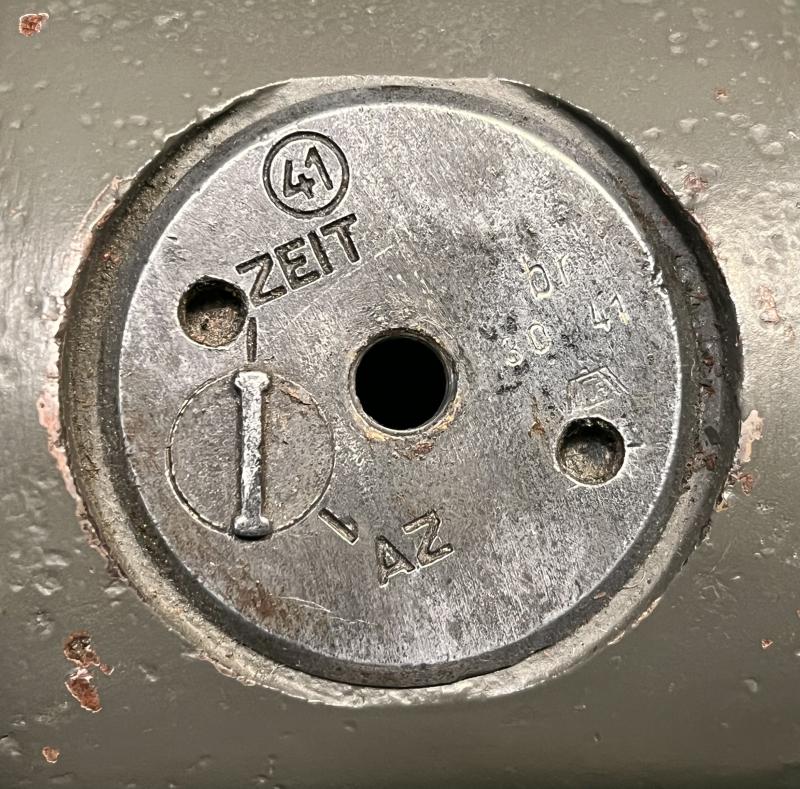 This example was made in 1942 and is fitted with a type 41 fuze which has a ' Zeit ' ( time ) setting which would detonate the bomb in the air, approximately 5 seconds after being armed. The ' AZ ( Aufschlagzünder - impact ) setting triggers detonation when the bomb hits the ground.