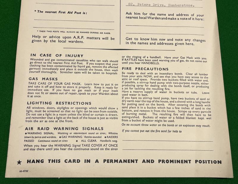 Information card designed to be filled in with local information about the location of warden's posts, first aid posts etc and hung in prominent positions in the locality. Also gives general ARP information. This example gives information concerning the Humberstone district of Leicester. In good used condition, pre punched with hanging tag.