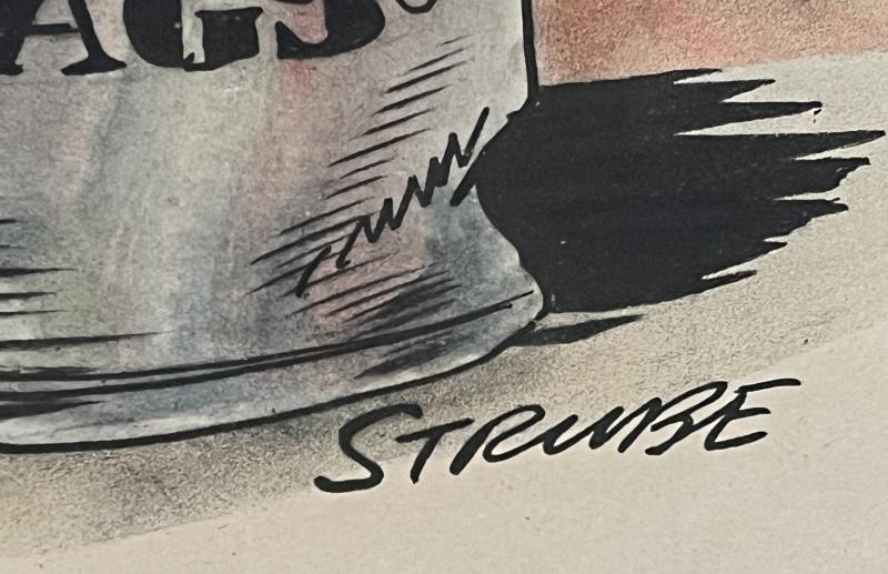 ' Strube was the editorial cartoonist of the Daily Express between 1912 and 1948. During these years, he assisted in making the Daily Express the best selling national newspaper in the world. In 1915, Strube enlisted in the Artists Rifles Battalion and served on the Western Front alongside other artists and writers such as Paul Nash and Wilfred Owen. Strube’s greatest creation was the ‘Little Man’, a figure large sections of the population then identified with. During the 1930s, Strube’s ridiculing of Hitler and Mussolini led the Daily Express to being banned in Germany and Italy. Strube’s name, alongside many other prominent critics of Hitler’s regime, was discovered on a Nazi hit list after the war. '