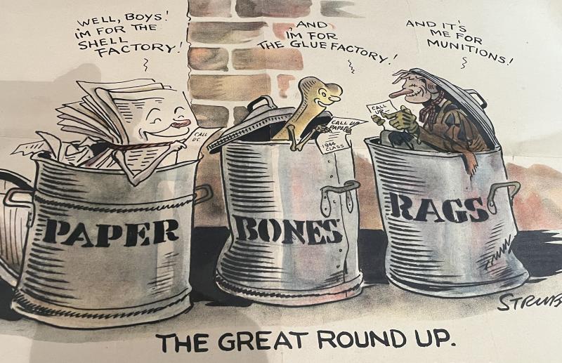 495mm x 75mm approx. Published by the Ministry of Supply and drawn by the artist Strube this poster was part of the Ministry's salvage campaign entitled ' The Great Round Up ' C1944. Published by Flemings, Leicester.