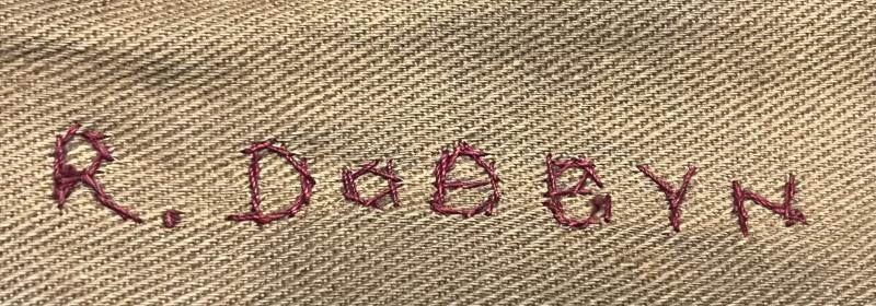 Tunic accompanied by a pair of '40 Patt trousers, again named to Dobbyn with a WD inspection mark, no further marking. Complete with both ankle adjusters and in generally good condition other than the not uncommon moth degradation to the groin and inside leg. Good named uniform to one officer.
