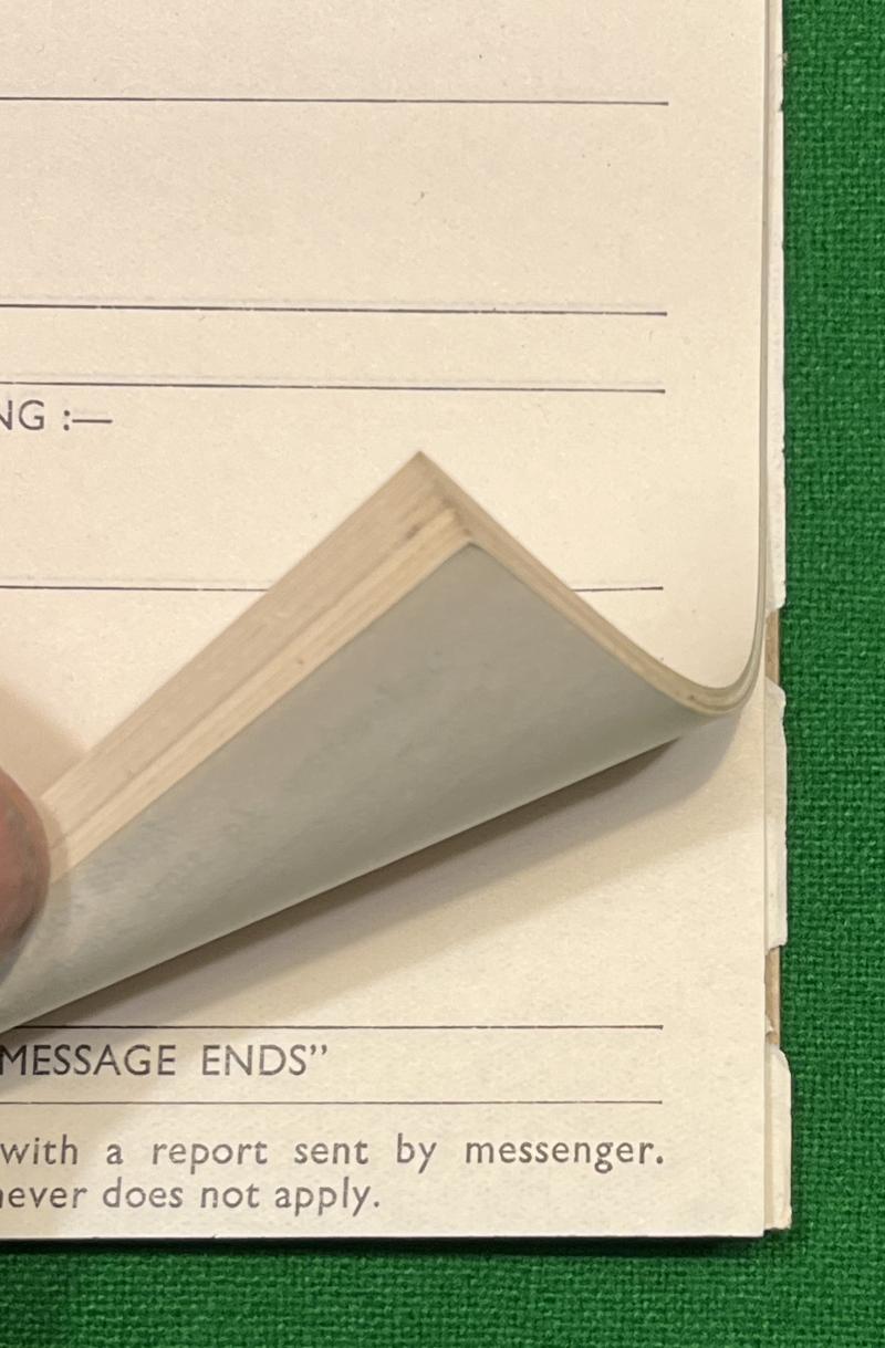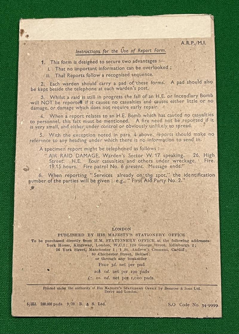 Pad of the standard Warden's report form, A.R.P./M.1. Instructions for use of the form printed to the reverse card support. The 1939 printed forms include sections for air raid damage, type of bombs, casualties, uxbs etc. Overstamped to the reverse to provide for a supplementary report. Good, clean condition with approx.25 forms remaining.