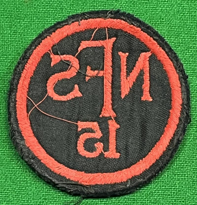 Embroidered red on blue wool National Fire Service area 15 breast badge. For wear on the heavy duty NFS tunic. Area 15 covered the South Bucks fire force area with its headquarters in Taplow. In good, used condition with evidence of having been removed from a tunic.
