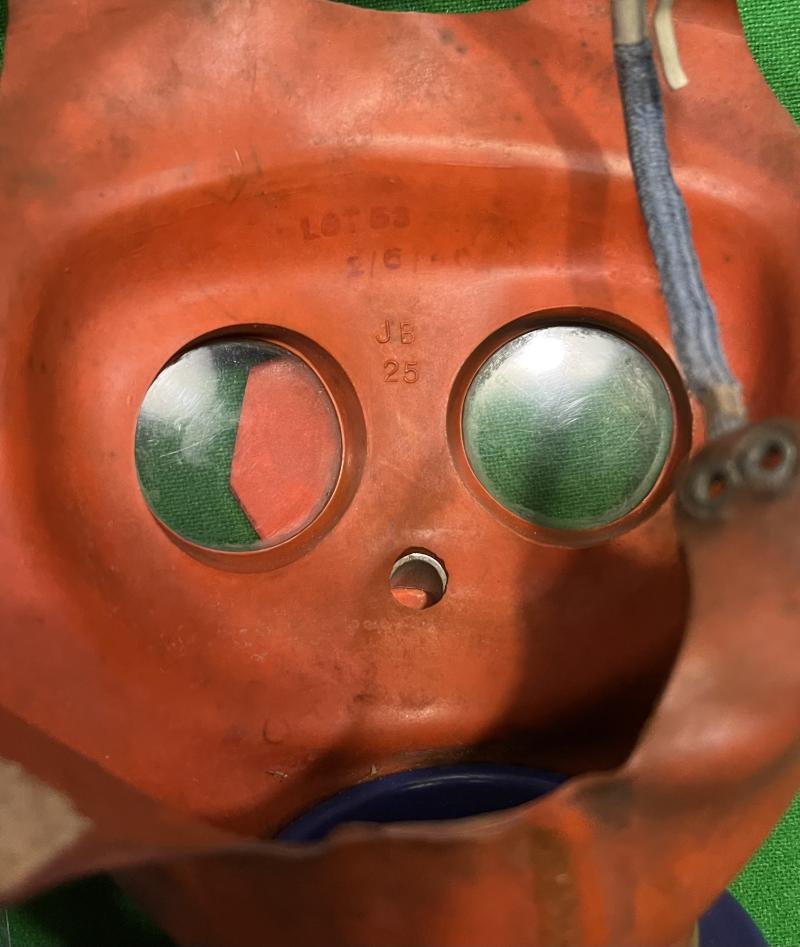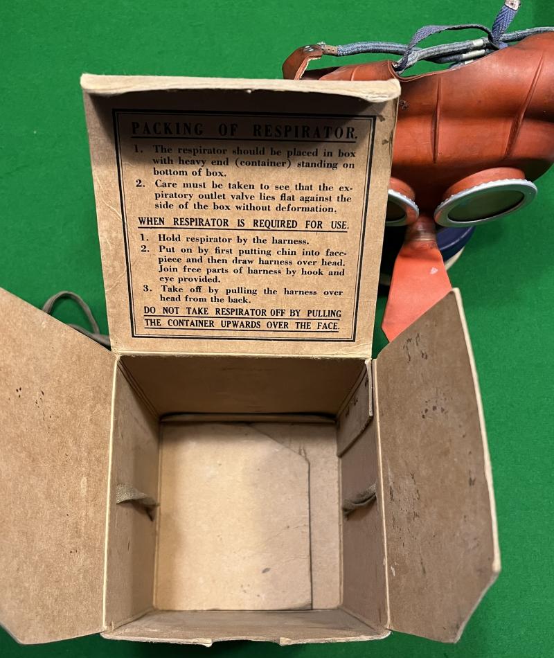 example of the small child's respirator contained in it's original cardboard case and complete with explanatory leaflet. Produced in a child friendly orange rubber with a blue coloured filter similar to the American produced child's mask that was specifically designed to look like Mickey Mouse and to be less frightening to children. The British version was less convincing and this example was probably produced by the John Bull Rubber Co.Ltd., in 1940 and is fitted with the Cortex Extension filter. In good, slightly dusty but supple condition with all elastics intact.Cardboard case in used condition with some marking, rubbing complete with carrying strap. Excellent example.